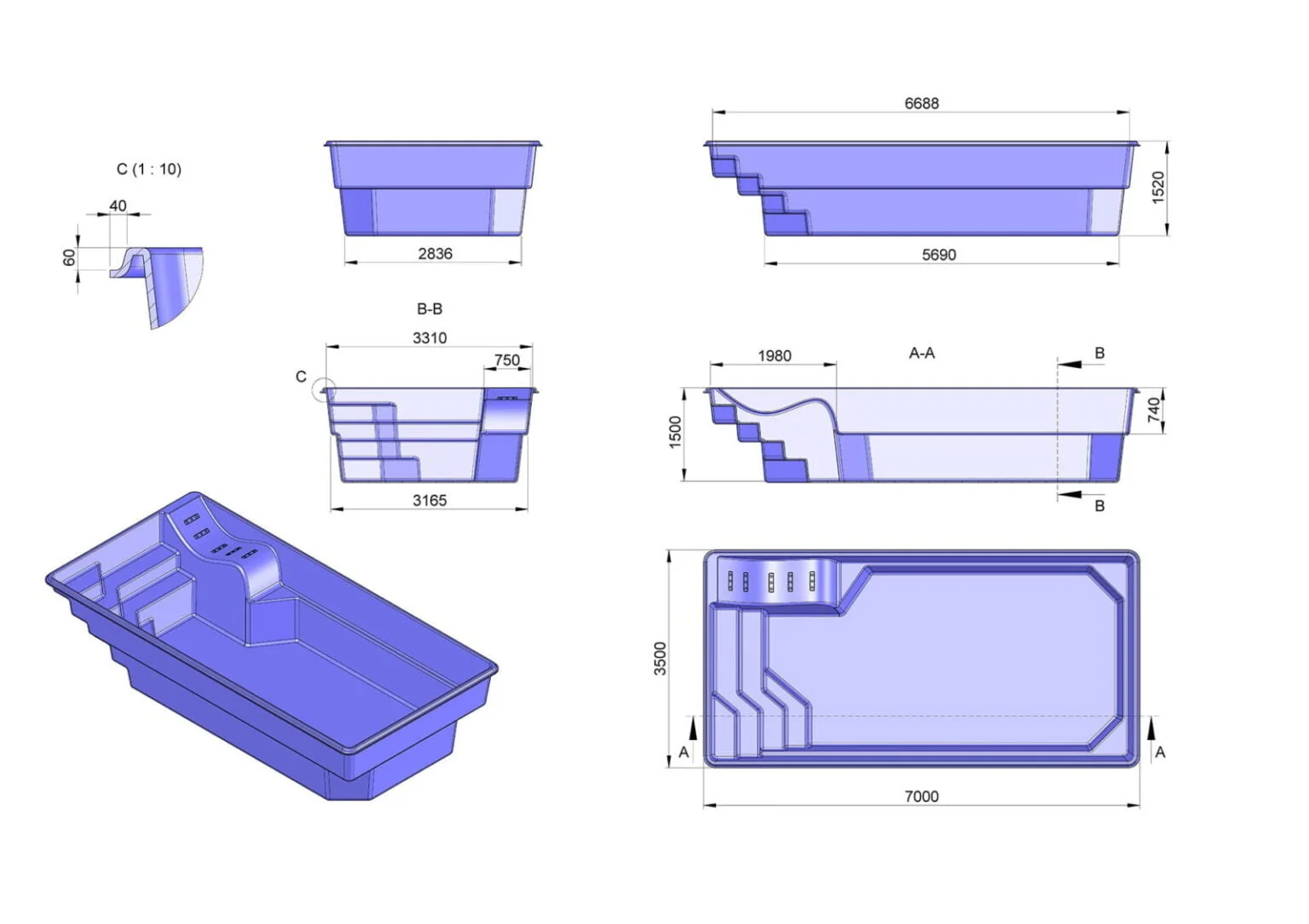 Abmessungen: 7,00 m × 3,50 m × 1,50 m