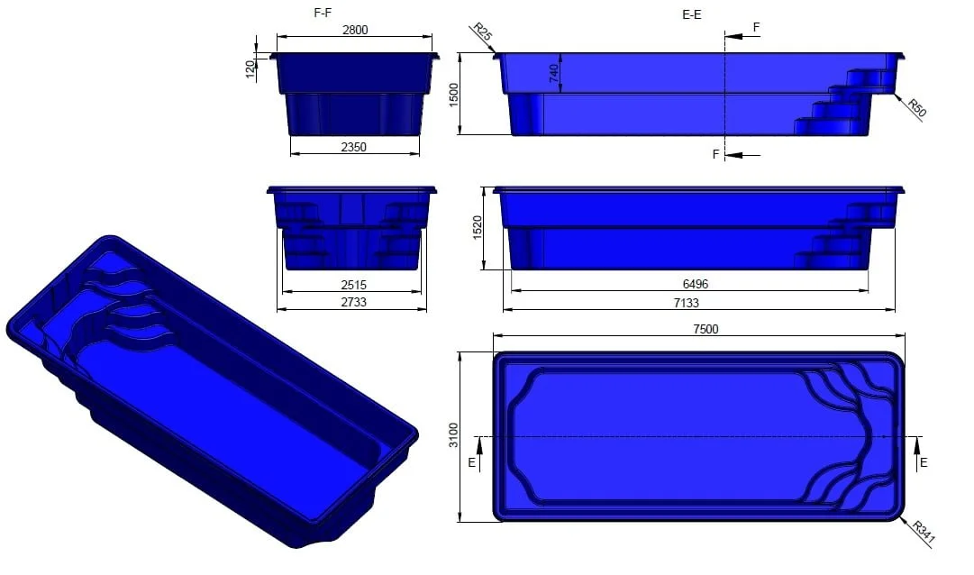 Abmessungen: 7,50 m × 3,10 m × 1,50 m