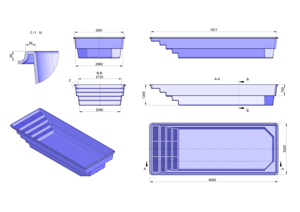 Abmessungen: 8,00 m × 3,20 m × 1,30 m